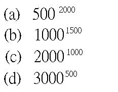 500^2000 = 8.71e+5397 1000^1500 = 1.00e+4500 2000^1000 = 1.07e+3301 3000^500 = 3.64e+1738